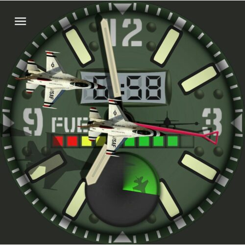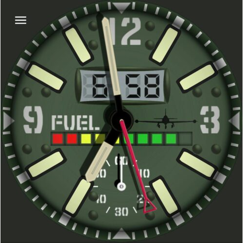 Tap action. Center tap for radar or stopwatch. Stopwatch start, 9, reset, 3. Tap 12 to turn dim on or off. Military time digital display. Fuel gauge. Rivets to hold everything together.