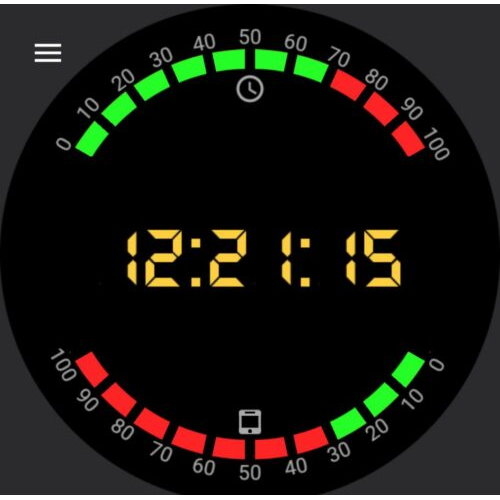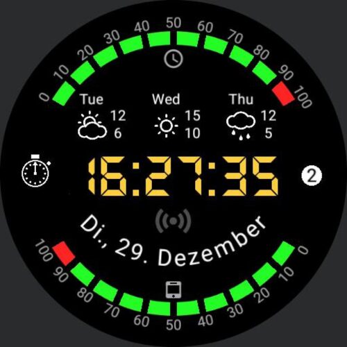 This watchface shows the most important information on the main screen, like time, date, battery levels, weather forecast and WiFi level. However, if you like less you can choose what is displayed. On the center right the number of agenda items are shown (if there are agenda items). The watchface has two sub-screens for stopwatch and agenda. The agenda shows all 10 items completely. No truncated text, long item text is shown in multiple lines. The complete text can be scrolled by two buttons.
