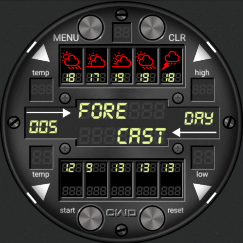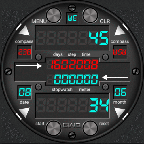 Directions digital watch: UPDATE: The time in screen 6 was not correct. This is fixed now. My apologies. Screen 1: Time, step, meter, watch and phone battery meter, stopwatch, days in year, date, day and am/pm. Screen 2: Stopwatch. Screen 3: Weather today. Screen 4: Weather and air pressure. Screen 5: 5 day forecast. Screen 6: Outdoor: Compass, date, day, step and meter counter. Stopwatch, days in year. 24h clock. 17 colors. Dim mode: Off, normal and auto. Enjoy.