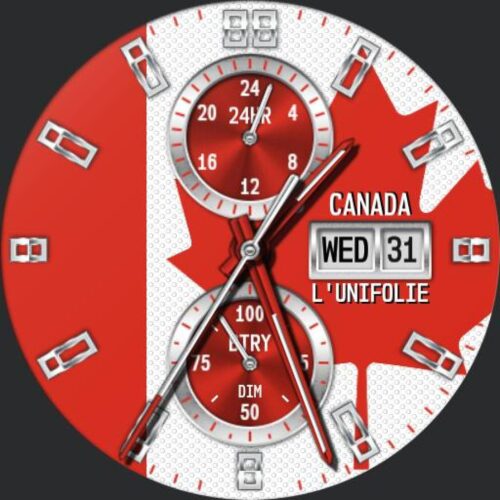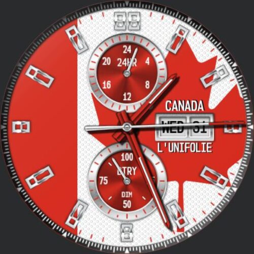 Quirk Watchworks is happy to present a new model: the Flag of Canada Modular Racer! Based on one of Sean Grondin's modular race watches, this one is customized for fans of the maple leaf. Tap 6 o'clock to turn the dim off and on. Tap the center to experience 3 levels of zoom. Tap the top of the bezel to rotate it to the minute hand and back. Please to enjoy!