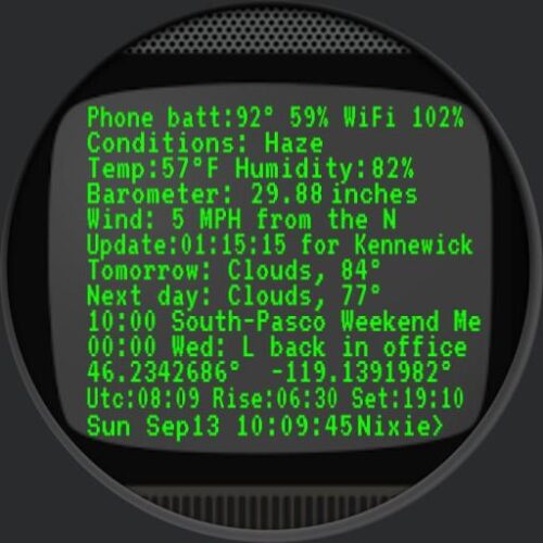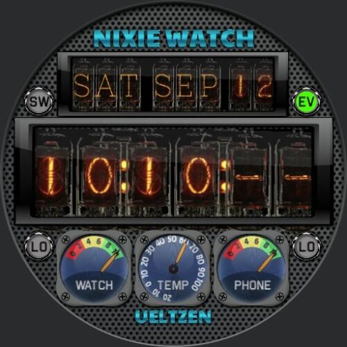 A Nixie tube watch. Tap the seconds for stopwatch, and again to return to time mode. Tap the date digits for info screen. Tap the center of the screen to return to time mode. Tap the top of the info screen to update weather. Indicator light on left is yellow when stopwatch is running, and right is green when there are calendar events. Indicators by the battery meters light up red when below 30%. In chronograph mode, digits in the upper right are stopwatch hours. Thanks to Peter Hull for the VT323 computer terminal font. Best if WX data is set to OpenWeatherMap for proper barometric pressure etc. Reworked from my original nixie tube watch. This is the 24 hour version. Fixed errors etc. Note that the : (colons) flash, and didn't appear in the preview.