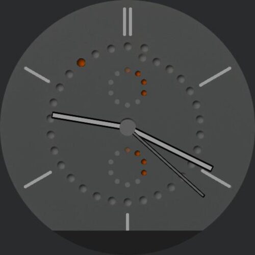 This watch is based on the same style as the Ochs & Junior watches, but is a variation of my own design. Its analogue date display is more readable than a digital display from the same distance. And unlike large digital displays, the date dot is not a distraction when checking the time. The 10 holes on the lower dial display the charge remaining in your watch (the top hole pulses whilst charging). The 10 holes on the upper dial display the charge remaining in your phone (the top hole pulses whilst charging). Tapping the center will change the watch face colour from grey to blue to green to yellow.