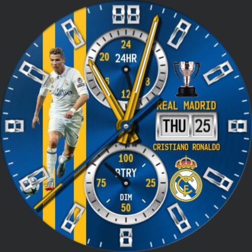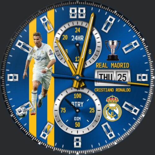 In cooperation with Adam Cohen, the QWW Sport Division is proud to announce the 2017 Futbol Champions Collection! Five leagues, five teams, five elite players, and five champions. The next team is Real Madrid C.F., champions of Spain's La Liga! Based on one of Sean Grondin's beautiful modular race watches, this one is customized for fans of Cristiano Ronaldo. Tap 6 o'clock to turn the dim off and on. Tap the center to experience 3 levels of zoom. Tap the top of the bezel to rotate it to the minute hand and back. Tap the league logo to reveal the league trophy. Please to enjoy!