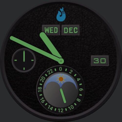 Basic watch, with day/night display, that changes using the sunrise/set times the app collects. Displays date. Second hand displays battery level during dim.